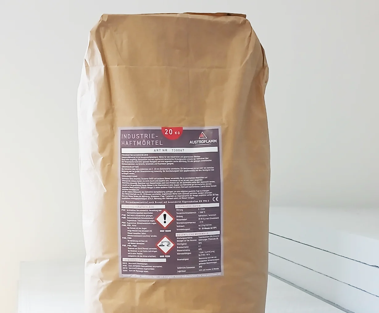 Austroflamm INDUSTRIE-HAFTMÖRTEL – hidraulično-keramičko vatrostalno ljepilo za industrijske i komercijalne primjene. Finoća granulacije 0–2 mm, temperaturna otpornost do 1000°C, potrošnja cca 1,5 kg/m²/mm.